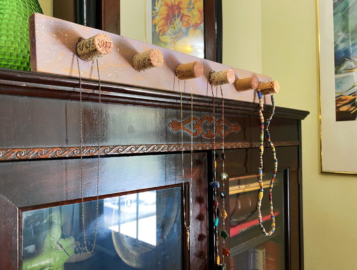 Improperly storing your necklaces, bracelets, and chokers can result in tightly tangled knots of chain that require an eye magnifying glass a la that old guy from Toy Story to actually undo. Skip the hassle of unlocking the puzzle that is a tangled necklace chain and store your jewelry on this easy-to-make wine cork necklace rack. Not only do your chains stay tangle-free and ready-to-wear, but they also double as an eye-catching wall decoration while they’re waiting to be worn.