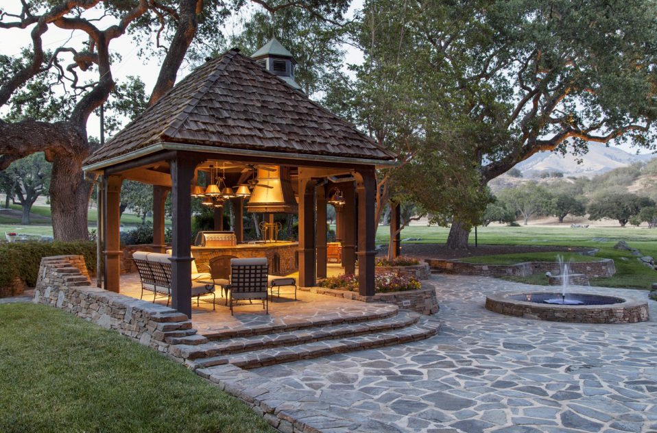 The main house, which was designed in the French Normandy style, contains six bedrooms, including a two-story master suite, a formal living and dining room, a chef’s kitchen, as well as multiple fireplaces. The grounds surrounding the home feature a covered barbecue area, basketball and tennis courts, a 50-seat movie theater, and a free-form swimming pool. There’s also a four-acre lake with a fountain for added charm.