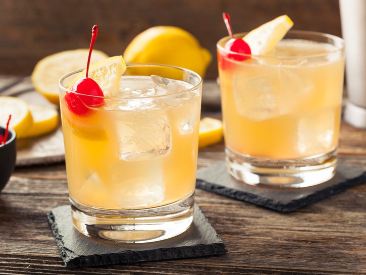 Whiskey, simple syrup, and lemon is a mouth-watering, sour burst that you can indulge in just about any time during the year. You can ask the bartender to switch up the garnish, too, based on your personal tastes and an added cherry makes things extra sweet.